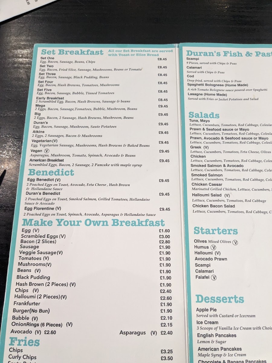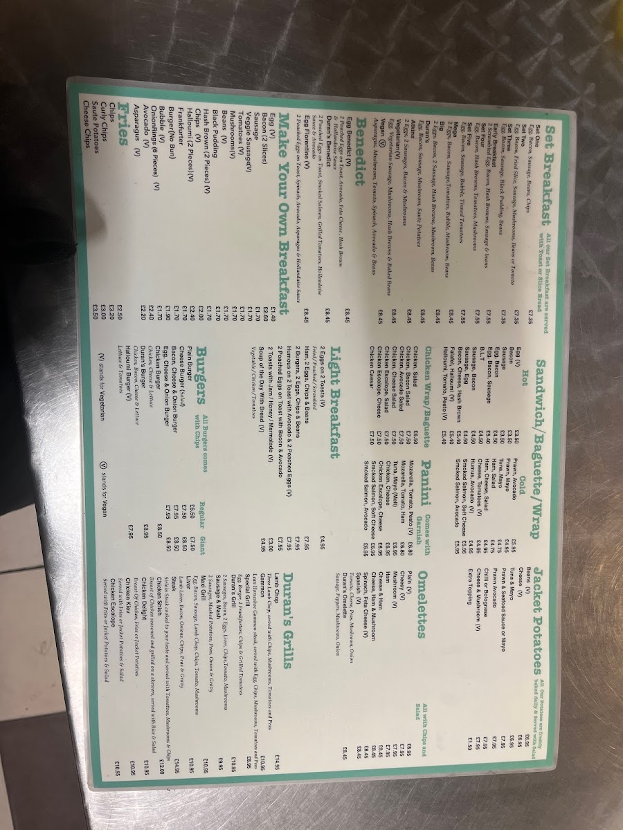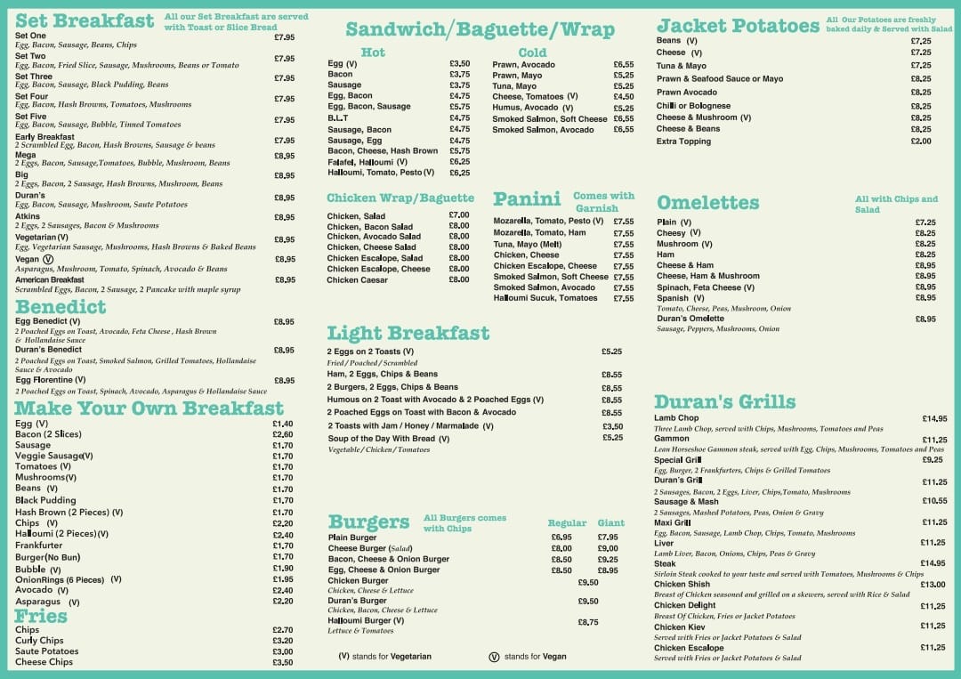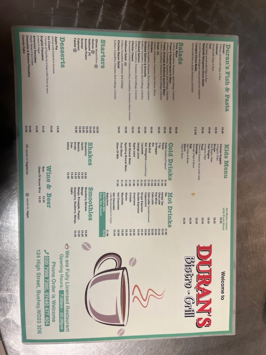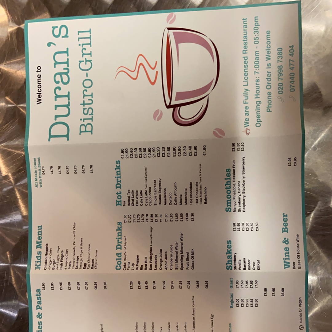 Duran's Bistro Grill offers a diverse and appealing menu, catering to various tastes and preferences. For the little ones, the Kids Menu features classic favorites such as Chicken Nuggets, Burger, CodFish Fingers, and Pizza. Appetizers like Mixed Olives, Humus, Halloumi Avocado Prawn, and Scampi kick off the dining experience. Those in the mood for a smoothie can enjoy refreshing options like Strawberry, Banana, Vanilla Mango, or Banana. For hot drink lovers, there's a selection including Beer, Glass of House Wine, and more. The Set Breakfasts provide a hearty start to the day, with options like Set Two through Set Five, alongside the Early Breakfast. Duran's Fish & Pasta section includes delicious dishes such as Scampi, Calamari, Spaghetti Bolognese, Lasagne, and Cod. For a lighter option, the Salads menu features Tuna Mayo, Prawn & Seafood Sauce, and Greek Chicken salads. For fans of Benedict, choices include Egg Benedict, Duran's Benedict, and Egg Florentine. Desserts like Apple Pie, Ice Cream, and a variety of pancakes, including Chocolate & Banana Pancakes, are perfect for satisfying your sweet tooth. The Fries selection includes Chips and Curly Chips, while Paninis and Baguettes offer a range of fillings, such as Sweet Chili Chicken, Mozzarella Pesto, and Ham & Cheese. The BBQ Chicken section boasts dishes like Chicken Delight, Chicken Shish, and Chicken Kiev. For a more filling meal, the Omelettes include options like Plain, Cheesy, and Mushroom, while Light Breakfast items, such as 2 Eggs on 2 Toasts and Ham with 2 Eggs, provide great breakfast options. The Grills menu offers dishes like Lamb Chop and Sausage & Mash. Cold and refreshing beverages, including Coke, Fanta, and Herbal Tea, complement the food offerings. Finally, the Jacket Potato selection includes fillings like Beans & Cheese and Prawn & Seafood Sauce.