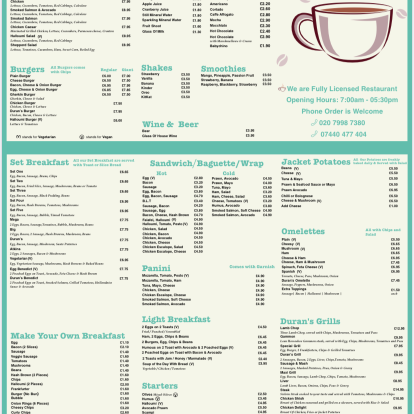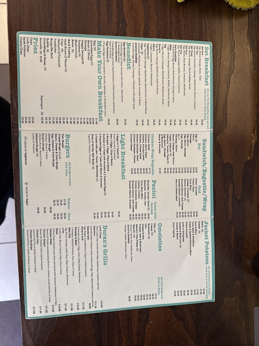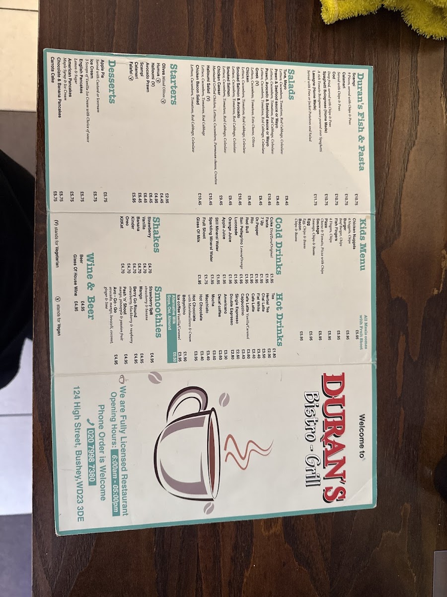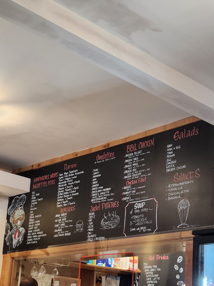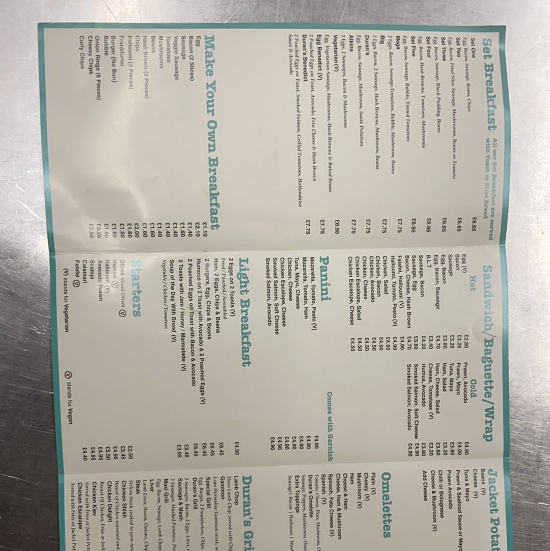 Duran's Bistro Grill offers a diverse and appealing menu, catering to various tastes and preferences. For the little ones, the Kids Menu features classic favorites such as Chicken Nuggets, Burger, CodFish Fingers, and Pizza. Appetizers like Mixed Olives, Humus, Halloumi Avocado Prawn, and Scampi kick off the dining experience. Those in the mood for a smoothie can enjoy refreshing options like Strawberry, Banana, Vanilla Mango, or Banana. For hot drink lovers, there's a selection including Beer, Glass of House Wine, and more. The Set Breakfasts provide a hearty start to the day, with options like Set Two through Set Five, alongside the Early Breakfast. Duran's Fish & Pasta section includes delicious dishes such as Scampi, Calamari, Spaghetti Bolognese, Lasagne, and Cod. For a lighter option, the Salads menu features Tuna Mayo, Prawn & Seafood Sauce, and Greek Chicken salads. For fans of Benedict, choices include Egg Benedict, Duran's Benedict, and Egg Florentine. Desserts like Apple Pie, Ice Cream, and a variety of pancakes, including Chocolate & Banana Pancakes, are perfect for satisfying your sweet tooth. The Fries selection includes Chips and Curly Chips, while Paninis and Baguettes offer a range of fillings, such as Sweet Chili Chicken, Mozzarella Pesto, and Ham & Cheese. The BBQ Chicken section boasts dishes like Chicken Delight, Chicken Shish, and Chicken Kiev. For a more filling meal, the Omelettes include options like Plain, Cheesy, and Mushroom, while Light Breakfast items, such as 2 Eggs on 2 Toasts and Ham with 2 Eggs, provide great breakfast options. The Grills menu offers dishes like Lamb Chop and Sausage & Mash. Cold and refreshing beverages, including Coke, Fanta, and Herbal Tea, complement the food offerings. Finally, the Jacket Potato selection includes fillings like Beans & Cheese and Prawn & Seafood Sauce.